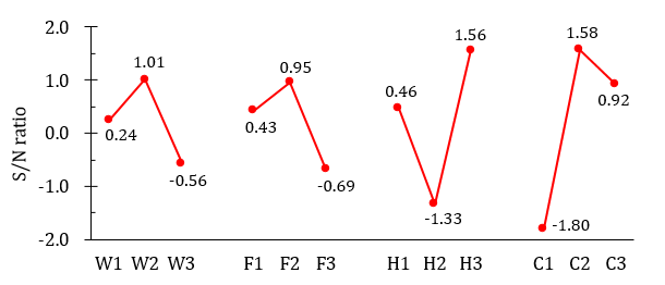 The contribution of a factor is the percentage of the sum of squares (SS), that is, the percentage of the factor variance to the total quality loss [15]-[16]. It is clear from the ANOVA table that the contribution of coating process (C) is 48.0% of the total variation, which is the highest contributor to the variability of the experimental results. The contribution of heat treating process (H) is 32.1%, which is the second highest contribution. However, the factors of the forming process (F) and wire manufacture (W) are not significant for the S/N ratio because their contributions are relatively small.