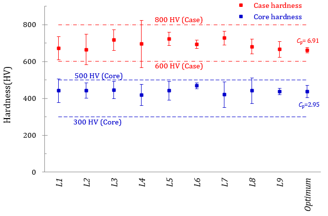Compared with the results of the nine tests, the optimum mean case hardness of 662.4 HV is smaller than the mean value (693.2 HV in Table 3), the natural variation of the process (6S) is obviously decreased and much smaller than the given tolerance band, as shown in Figure 3, and so the optimum process-capability ratio, Cp = 6.91, is much larger than 1. The optimum mean core hardness of 437.8 HV is decreased as well compared to the average (439.7 HV in Table 3) and the natural variation of the process (6S) is also much smaller than the given tolerance band, as shown in Figure 3, and so the optimum process-capability ratio, Cp = 2.95, is larger than 1. This means that the process is capable of ensuring 99.73% of good products in hardness [1].