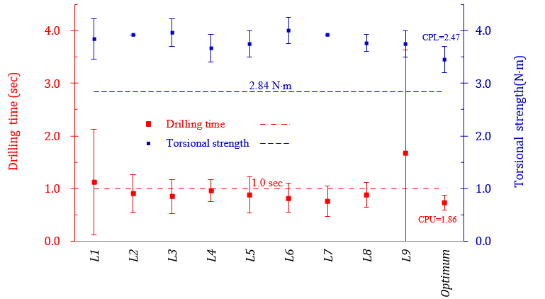 Although the three quality characteristics of tapping screws almost meet the requirement of specification for the nine tests, the drilling performance is not good enough, as shown in Figure 4, because all the natural variations of the process are exceeding the upper specification limit for the drilling time; and their process-capability ratios, CPU as shown in Table 4, are all smaller than 1. This means that the natural variations of the process are much larger than the specification limit given. Thus, the process is incapable of ensuring 99.73% of good tapping screws [1].